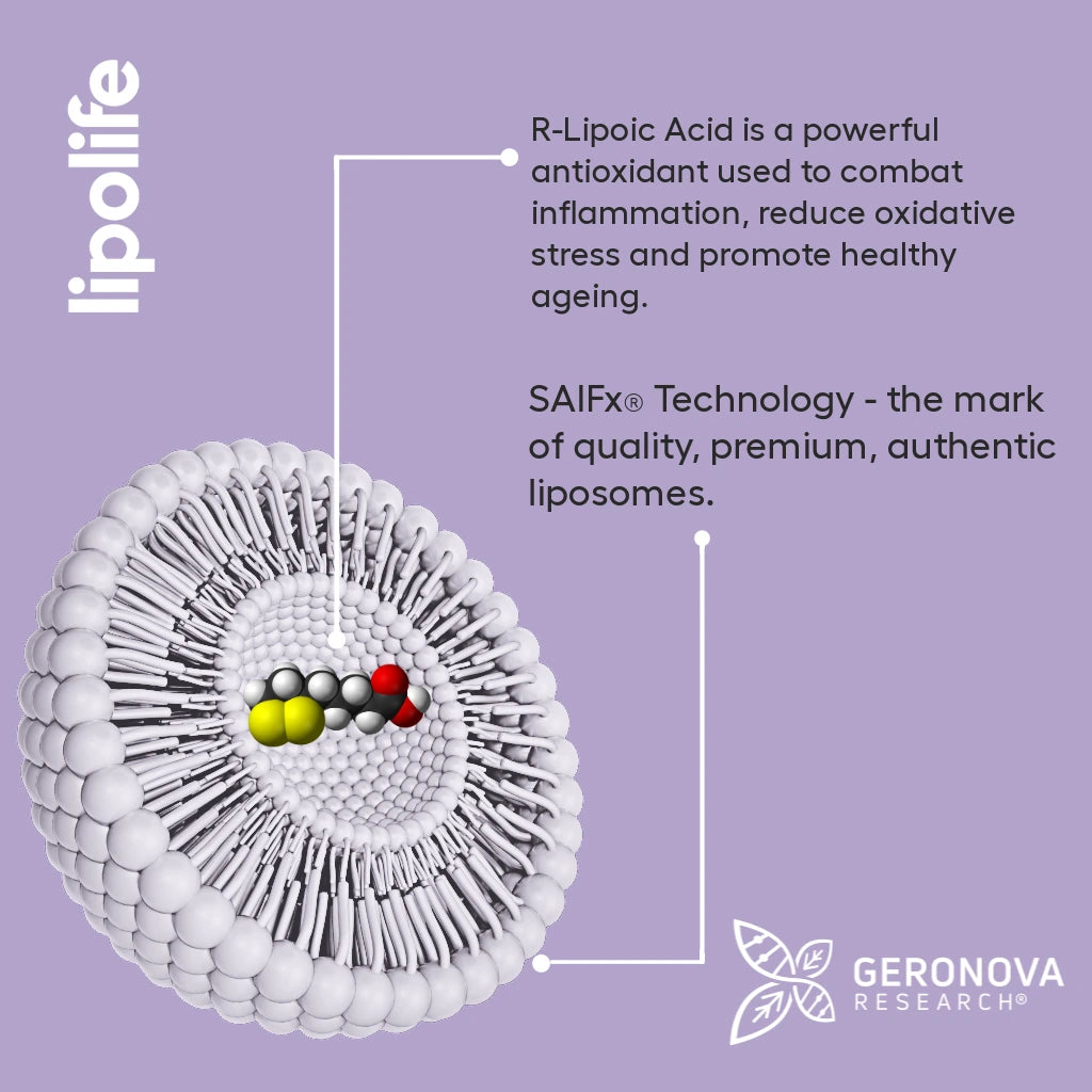 However, R-lipoic acid is notoriously unstable and poorly absorbed when taken on its own. That’s why lipolife® use the stabilised form developed by GeroNova Research, a global pioneer in R-lipoic acid innovation. By combining this clinically respected raw material with advanced liposomal delivery technology, lipolife® R-Lipoic Acid ensures maximum bioavailability and effectiveness.
